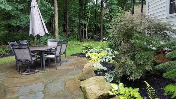 Functionality was restored to this marshy, wooded yard with the installation of an irregular bluestone paver patio, gravel path, built-in stone fire pit, separate dining area and dedicated grilling space nestled between the house and the tree line.
