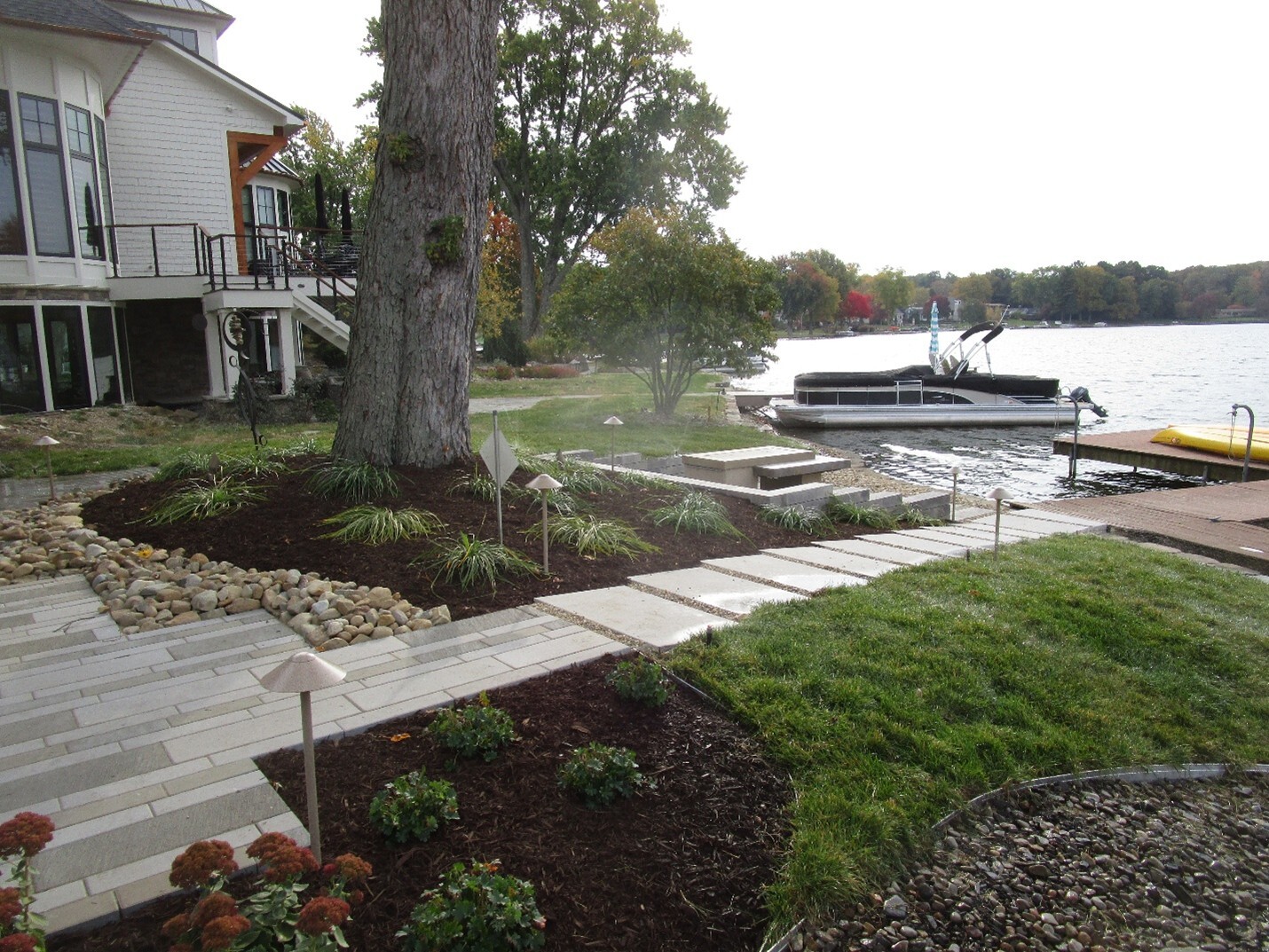 A client asked us to redesign his lakefront landscape and tie in his paver driveway. However, there was one significant challenge that we faced: space. The tight lot size left very little room for truck access and parking. There was even tighter access once we reached the backyard. The existing paver driveway and rear patio looked tired. We determined the patio needed to be enlarged and access was needed to get to the boat dock.