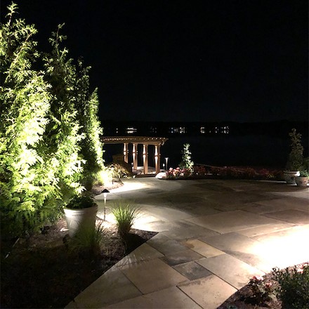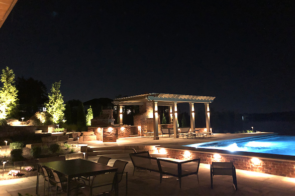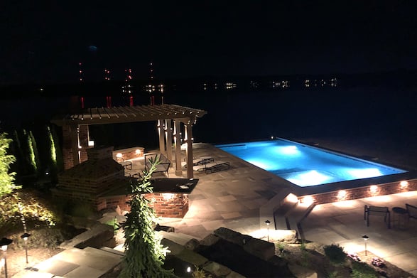 Strategically placed lighting highlights the strong architectural elements of this unique backyard paradise. Function and beauty meet to create a dramatic visual effect, extended patio usage, and safety. Request a quote today to learn how we can brighten up your estate.