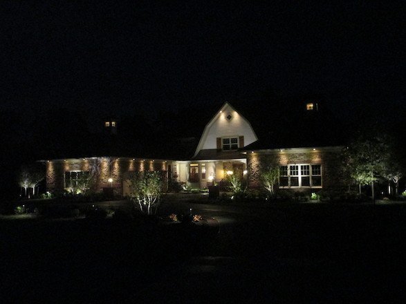 Custom landscape lighting highlights the natural beauty of this home with the flick of a switch. Our installation at this home allowed for a unique but functional look that brings dramatic curb appeal. This lighting was designed to highlight the architecture of the home and bring out the best details for nighttime display.